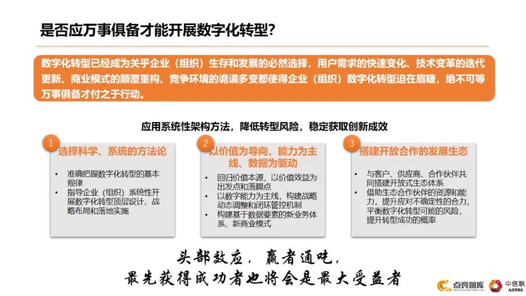 来自北京国信数字化转型技术研究院周剑院长指出,由于数智化转型已经成为关乎企业(组织)生存和发展的必然选择,用户需求的快速变化、技术变革的迭代更新、商业模式的颠覆重构、竞争环境的诡谲多变都使得企业(组织)数智化转型迫在眉睫,绝不可等万事俱备才付之于行动。