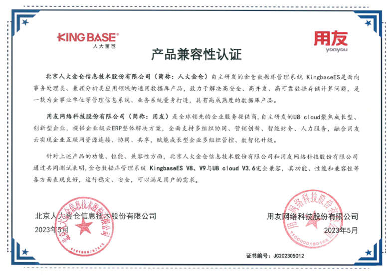 用友U8 cloud与人大金仓KingbaseES V8完成兼容互认证,共塑信创时代企业数智化