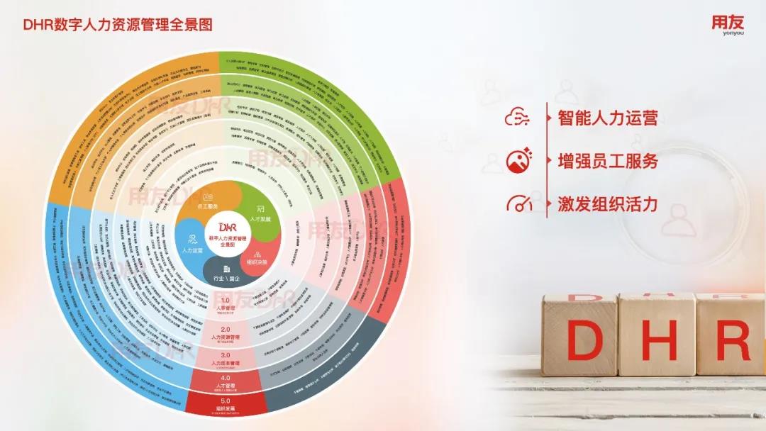 用友DHR数字人力资源管理全景图将人力资源数字化发展分为五个阶段:人事管理、人力资源管理、人力资本管理、人才管理和组织发展。