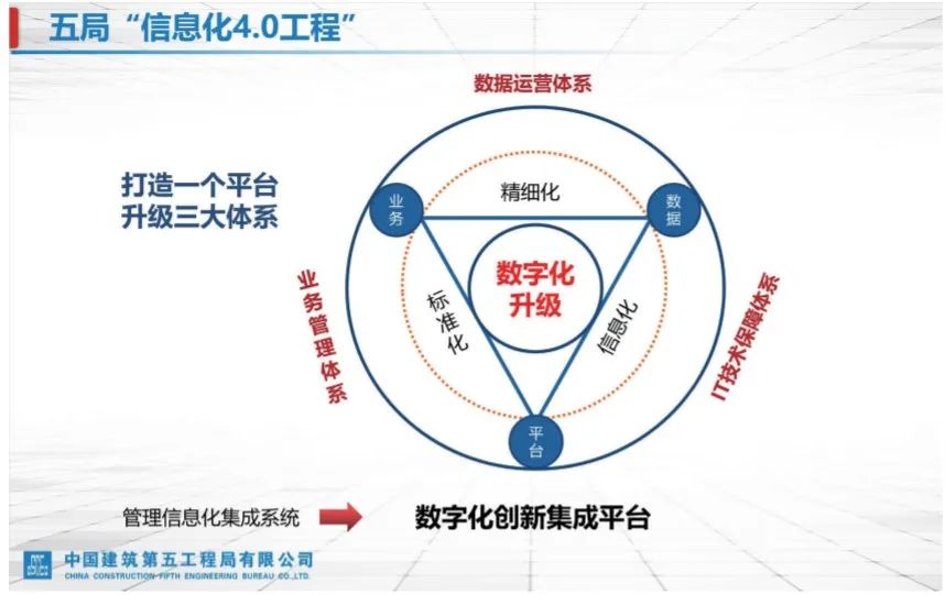 当前,数字化升级已经成为中建五局新时期的战略性工作,通过“信息技术创新”和“业务管理创新”双轮驱动,推进生产经营与数字化同步转型升级,从而助推企业的高质量发展。同时,通过数字化转型升级,打造“数字五局”,最终实现“企业管控集约化、资源配置高效化、业务管理精益化、生态互联协同化”。