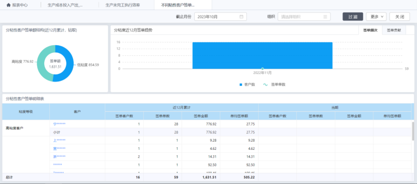 针对客户进行签单分析客户活跃度及客均签单额,了解客户的需求和购买习惯,判断客户粘性,从而提供更加个性化的服务和产品,提高客户满意度和忠诚度。粘性高的客户更可能成为忠诚客户并向其他用户推荐,从而提高企业的经济收益。同时,在对不同粘性客户的签单分析中,企业可以发现一些新的市场机会,更好地预测市场趋势。例如,某一客户的购买量或购买频率明显增加,那么企业需要根据这一趋势调查原因,调整并制定更加精准的销售策略,提高销售效果,引导销售增长。