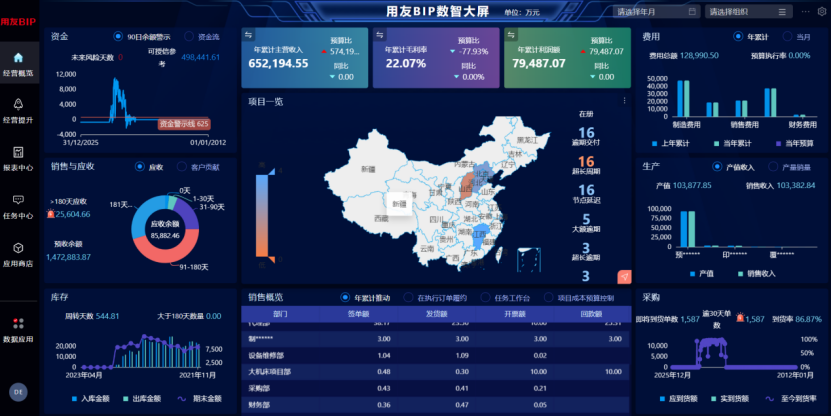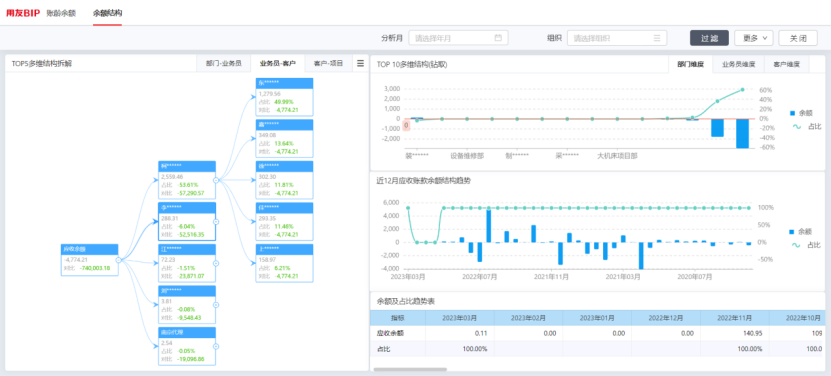 随着业务规模的扩大,客户数量增加,应收账款可能会积累成大额资金占用,如果无法及时回收,企业将面临流动性风险和资金链断裂的风险。通过数据看板,及时发现资金风险,当出现预警信号时,可以进一步按指标或不同维度展开分析,如从部门、业务员等多维度进行应收账款分析,还可以从余额结构分析是哪个区域、哪个业务员、哪个客户的应收账款太高,及时催款,保障企业资金安全,降低因应收周转不畅导致的资金风险,增强企业的抗风险能力,实现企业的稳健经营。