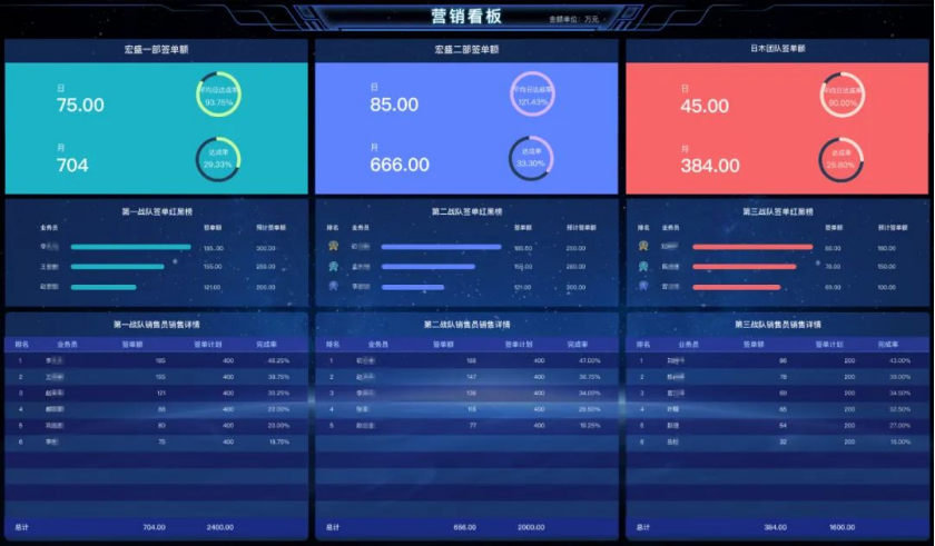 在数据应用服务系统的加持下,管理者通过“营销看板”数智大屏,一屏展现销售战绩情况,有效分析了业绩目标和差距,帮助销售及时调整;同时,销售人员可以实时收到新签订单提示,可在签单业绩红黑榜中实时看到自己和部门间其他同事的业绩差距对比,督促销售人员及时跟进自己的客户,形成良性竞争,提高企业整体效益。