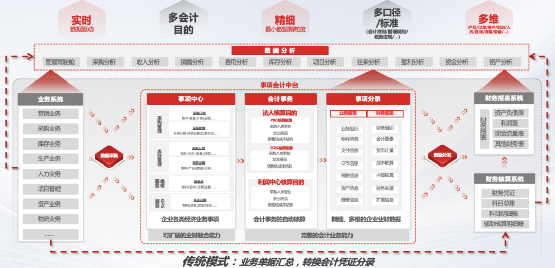 在分享中,徐洋讲到,有一项变革尤其引人注目,那就是事项法会计在企业的落地。1966年,美国会计学家乔治·H·索特提出了事项法会计理论,颠覆了传统的价值会计观念。事项会计的本质是将企业的采购、入库、生产、销售等业务经济活动定义为一个个“事项”,核心在于基于“事项”的实时(业务事项发生即采集核算,实时感知业务)、精细(采集最精细颗粒度的业务事项)、多维(多目的多口径多方法进行数据加工与分析)的核算与报告,彻底打通业务到财务的壁垒,重新定义了业财融合。